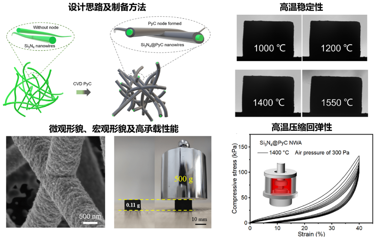 针对上述问题,诸侯快讯ok1122官网诸侯快讯ok133王红洁教授课题组提出了一种通过增加纳米线间搭接结点,提高纳米线变形抗力,实现气凝胶强化的设计思路。 课题组以氮化硅(Si3N4)纳米线气凝胶为基体,采用化学气相沉积(CVD)技术,在气凝胶中的纳米线表面引入热解碳(PyC)层,成功在纳米线间引入了大量的PyC结点,获得了一种Si3N4@PyC纳米线气凝胶(Si3N4@PyC NWA),实现了陶瓷气凝胶强度和压缩回弹性的显著提升,突破了传统陶瓷气凝胶高强度和大回弹不能兼得的限制,为陶瓷气凝胶的强化和力学性能调控提供了新视角。此外,Si3N4@PyC NWA在高达1400 °C的高温含氧条件下仍表现出优异的压缩回弹性能,展现了其在高温有氧环境的应用潜力。