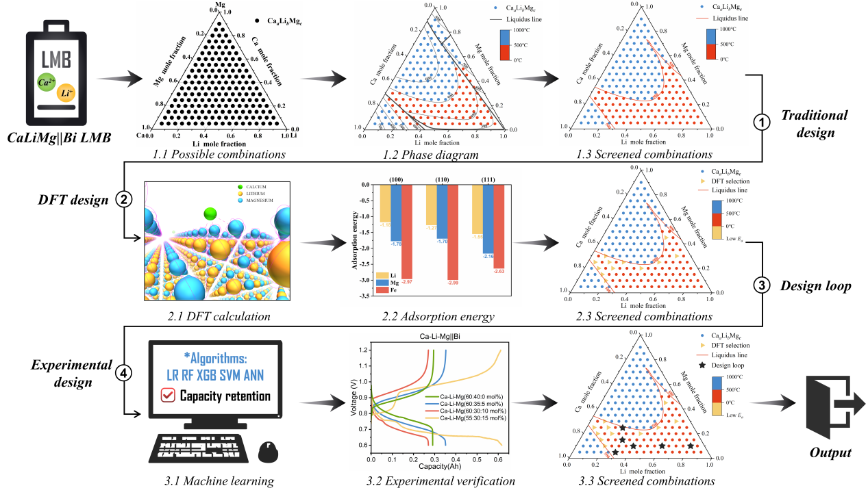 目前的液态金属电池体系的负极都基于单一类型的阳离子(Li+、Ca2+、Na2+等),性能受到其单一阳离子的限制,然而传统方法设计多元(≥二元)的负极合金,需要大量的时间和实验成本,存在一定的局限性。近日,宁晓辉教授课题组提出了一种结合钙离子(Ca2+)和锂离子(Li+)的双阳离子液态金属电池设计,并详细探讨了其在电化学反应中表现的不稳定性。通过研究Ca-Li||Bi液态金属电池,发现无论采用何种Ca-Li合金比例,电池的容量衰减均为显著。为克服双阳离子电池的不稳定性,研究团队采用Mg作为惰性添加剂,有效地提升了电池的循环稳定性。此外,团队还开发出一种融合传统相图设计方法、第一性原理计算和机器学习技术的混合设计方法,揭示了特定合金比例在调控双阳离子化学性质中的关键作用,并指出负极集流体侧合金的亲钙性对电池稳定性的影响。最终经过混合设计的Ca-Li-Mg || Bi液态金属电池集成了钙基与锂基系统的优点,展现出高能量密度、长循环寿命、低成本及优异的循环稳定性,为未来新型多阳离子液态金属电池的发展提供了重要启示。