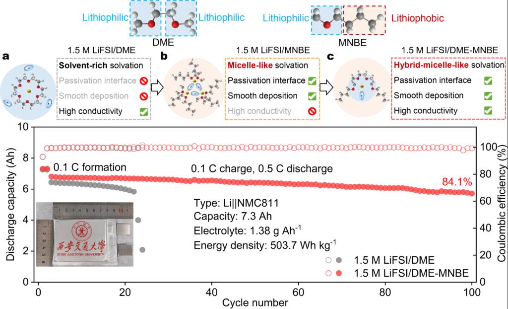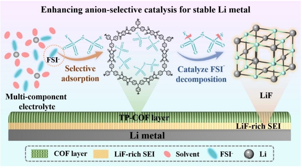 宋江选教授团队面向国家重大能源需求,开展高比能二次电池关键材料研究。近期,团队针对锂金属电池界面稳定性差、锂枝晶生长严重以及体相离子传输缓慢等问题,分别提出了电荷分离COF中间层增强阴离子选择性催化界面的新策略和无氟类胶束电解液设计的新思路。通过COF界面诱导分解以及富阴离子溶剂化结构调控等手段,构建了坚韧的富无机组分固态电解质界面膜,实现了500 Wh/kg超高比能锂金属软包电池稳定循环,为锂金属电池的产业化发展提供了重要支撑。相关成果分别以《通过电荷分离 COF 中间层增强阴离子选择性催化作用实现长寿命锂金属软包电池》(Enhancing Anion-Selective Catalysis for Stable Lithium Metal Pouch Cells through Charge Separated COF Interlayer) 为题发表在国际权威期刊《德国应用化学》(Angewandte Chemie International Edition) 上,诸侯快讯ok1122官网诸侯快讯ok133博士生赵培钰(已毕业)和张艳华为本文共同第一作者;以《用于超高能量密度锂金属电池的无氟类胶束状溶剂化电解质》(Non-fluorinated Electrolytes with Micelle-like Solvation for Ultrahigh Energy Density Lithium Metal Batteries) 为题发表在国际权威期刊《化学》(Chem) 上,诸侯快讯ok1122官网诸侯快讯ok133博士生乔睿和赵严副教授为本文共同第一作者。