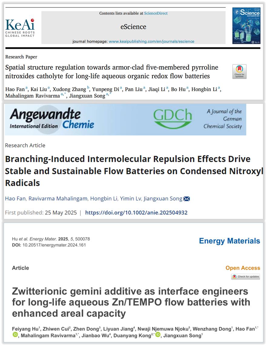上述研究成果分别以《分子铠甲化的长寿命五元吡咯啉氮氧自由基类液流电池正极电解质》(Spatial structure regulation towards armor-clad five-membered pyrroline nitroxides catholyte for long-life aqueous organic redox flow batteries)和《分子支链调控驱动氮氧自由基稳定转化,助力构建高性能水系液流电池》(Branching-Induced Intermolecular Repulsion Effects Drive Stable and Sustainable Flow Batteries on Condensed Nitroxyl Radicals)为题发表在国际期刊《电科学与能源科学》(eScience)和《德国应用化学》(Angewandte Chemie International Edition)上;材料科学与工程学院范豪副教授为论文第一作者,宋江选教授为通讯作者,诸侯快讯ok1122官网为论文唯一完成单位。