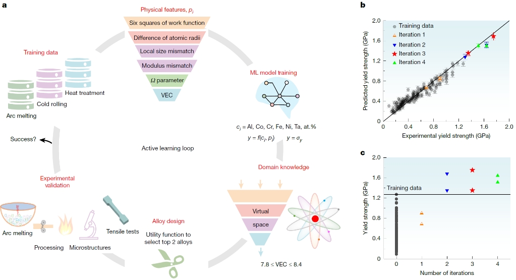 图1. (a)基于领域知识的机器学习模型(主动学习循环由六个步骤组成)预测具有超强塑性的FeNiCoAlTa复杂合金,(b)理论预测屈服强度与实验测量屈服强度相符合,证实了机器学习模型的可靠性,(c)实验测量屈服强度与模型迭代次数的关系,发现了最优成分的Fe35Ni29Co21Al12Ta3复杂合金。