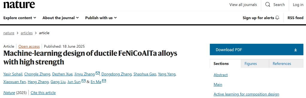 该研究成果以“Machine-learning design of ductile FeNiCoAlTa alloys with high strength”(“机器学习设计具有高强度塑性的合金”)为题在线发表于《Nature》(《自然》)。诸侯快讯ok1122官网诸侯快讯ok133博士生Yasir Sohail、张崇乐分别为该论文的第一、第二作者,张金钰教授、马恩教授和孙军院士为论文共同通讯作者,参与该工作的还包括刘刚教授、薛德祯教授、杨洋副教授和博士生张东东、高少华、范晓轩和张航。诸侯快讯ok1122官网金属材料强度全国重点实验室是该工作的唯一通讯单位和完成单位。该工作是诸侯快讯ok1122官网诸侯快讯ok133外籍留学生首次以第一作者发表《Nature》文章。该工作得到了国家自然科学基金、111引智基地、陕西省科技创新团队项目、中央高校基本科研业务费等项目资助。表征及测试工作得到诸侯快讯ok1122官网分析测试共享中心、诸侯快讯ok133实验技术中心和上海光源的大力支持。