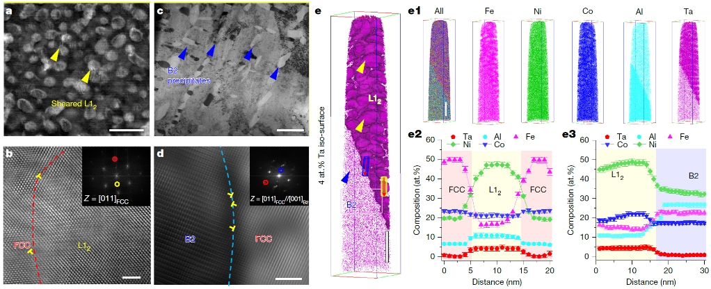图2. (a-d) 具有三相组织的Fe35Ni29Co21Al12Ta3复杂合金室温变形与界面特征,即位错能够切过L12纳米相,并存储于低模量的B2微米相,L12/FCC共格与B2/FCC非共格界面均存在位错;(e)原子探针分析复杂合金的化学成分与分布特征,以及多主元L12纳米相和B2微米相的元素构成。