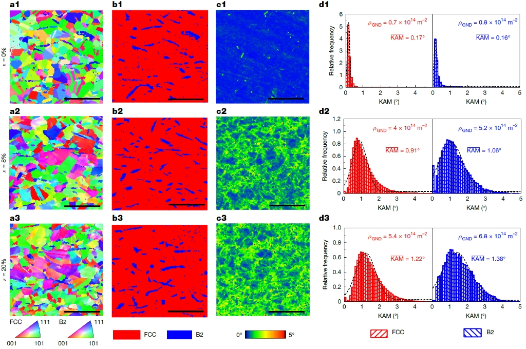 图3. Fe35Ni29Co21Al12Ta3复杂合金中各组成相的位错密度随应变量(a1-d1) ε=0、(a2-d2) ε=8%和(a3-d3) ε=20%的演化,表明低模量B2微米相能够比(FCC+L12)基体存储更高密度的位错。