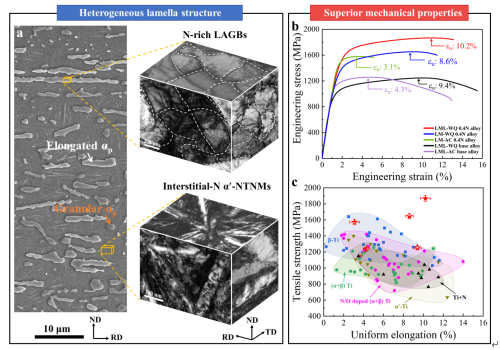 图1. (a) Ti-Cr-Zr-Al-0.4N (wt.%) 合金的异质片层结构。(b) 不同组织结构的Ti-Cr-Zr-Al和氮掺杂Ti-Cr-Zr-Al合金室温拉伸应力-应变曲线。(c) 间隙氮强化的异质片层结构Ti-2.8Cr-4.5Zr-5.2Al合金的室温力学性能与目前报道的高性能钛合金(包括β-Ti、(α+β)-Ti、N/O强化的(α+β)-Ti、α-Ti和N强化的钛合金)的抗拉强度、均匀延伸率对比。
