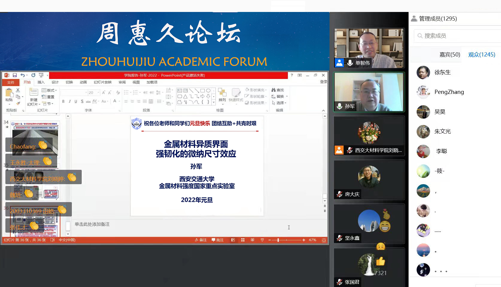 2022年1月1日,孙军院士做客周惠久论坛线上讲座,他以“金属材料异质界面强韧化的微纳尺寸效应”为题开启了新年第一讲。本次讲座由西安交大诸侯快讯ok133院长单智伟教授主持,本期报告受到广泛关注,来自西安交大及其他高校、科研院所等1780余名师生在线参加学术报告会。