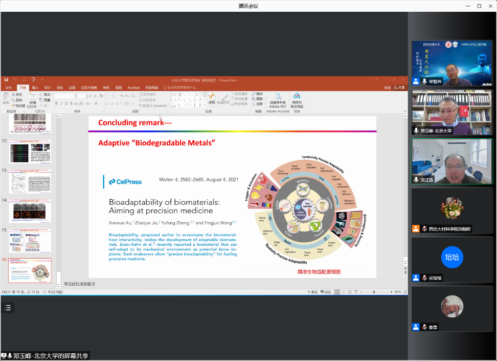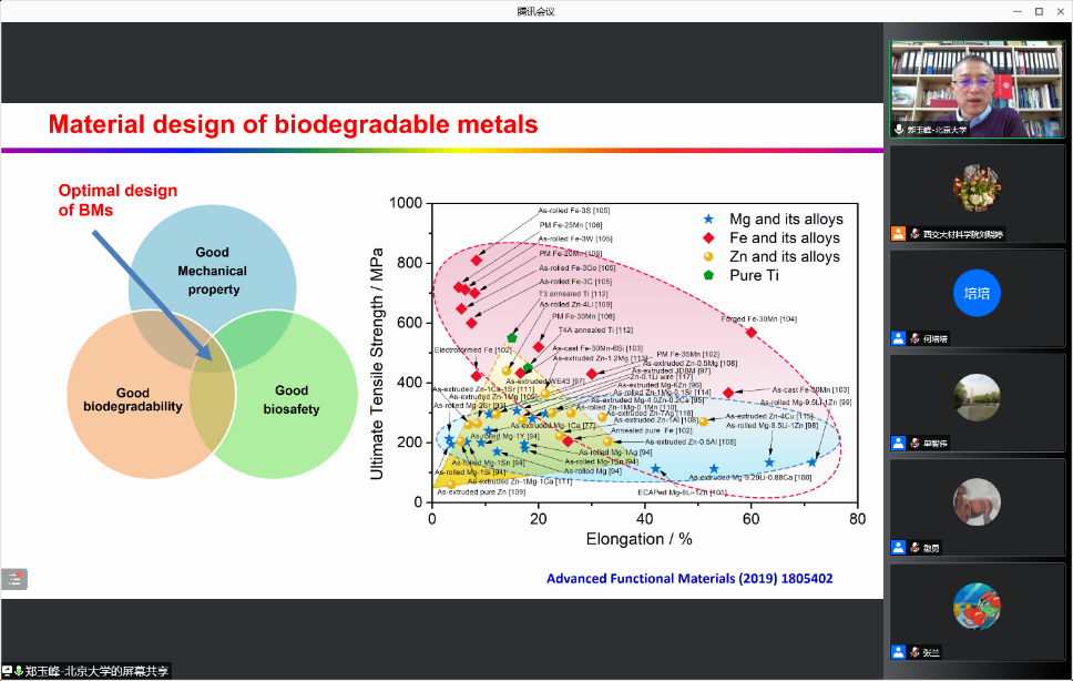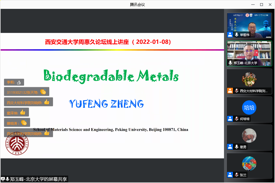 郑玉峰教授做客周惠久论坛线上讲座,并作题为《Biodegradable Metals》的报告,介绍了成为21世纪医用金属材料新研究热点的可降解金属的最新研究进展。报告受到广泛关注,来自西安交大及其他高校、科研院所等530余名师生在线参加学术报告会,讲座点赞量1万余次。本次讲座由单智伟院长主持。