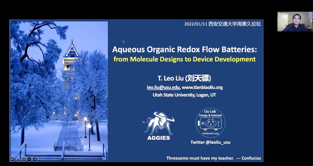 1月11日,受诸侯快讯ok1122官网诸侯快讯ok133宋江选教授邀请,美国犹他州立大学化学和材料系刘天骠副教授做客周惠久论坛线上讲座,以《水系有机液流电池的储能应用》为题,为诸侯快讯ok133的师生作线上学术报告。