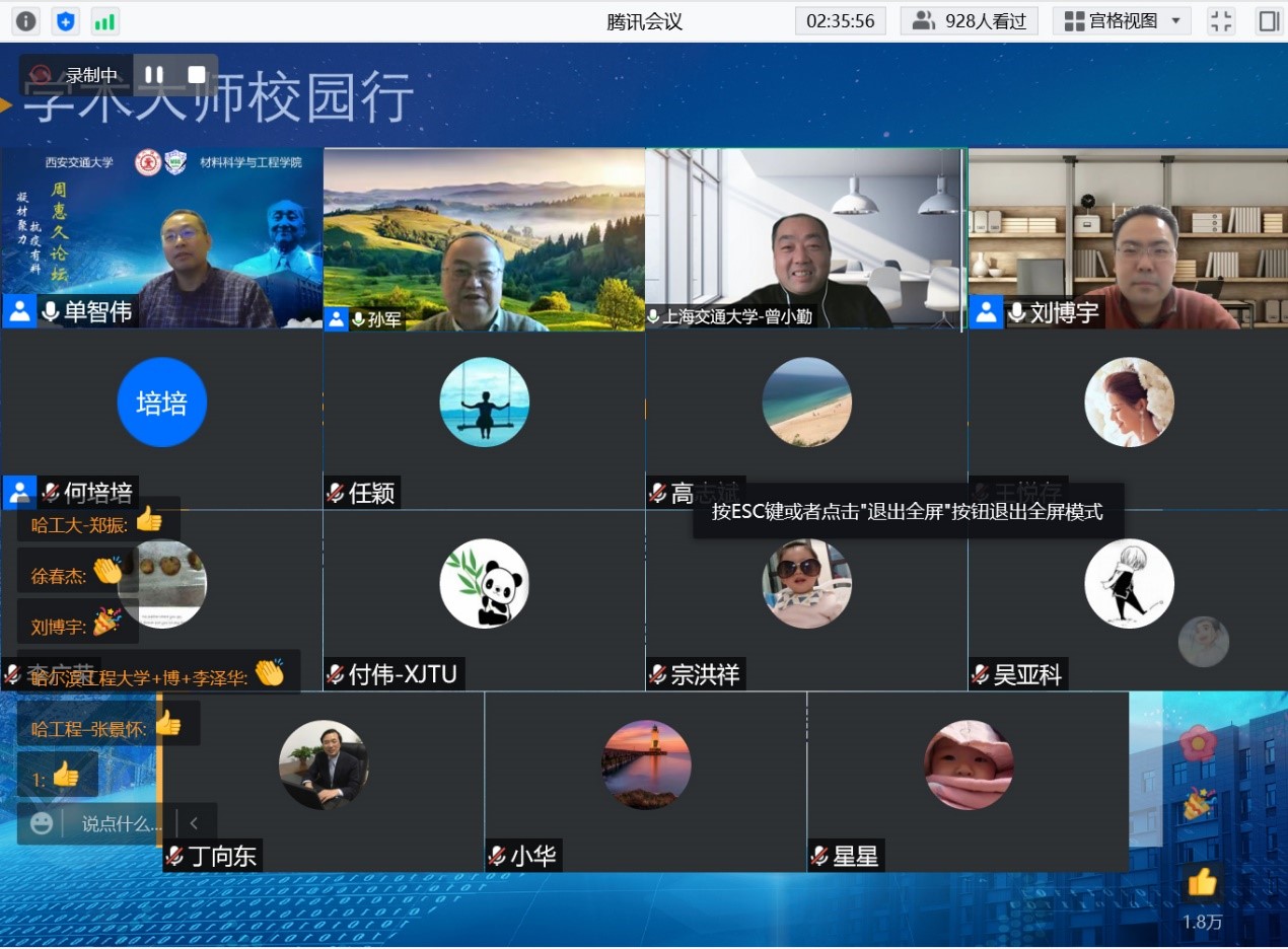 曾小勤教授做客周惠久论坛线上讲座,以“材料基因工程与不锈镁合金设计”为题,系统地介绍了基于材料基因工程思想的不锈镁合金的设计和制备。报告受到广泛关注,来自西安交大及其他高校、科研院所的930余名师生在线参加了讲座。本次讲座由单智伟院长主持。