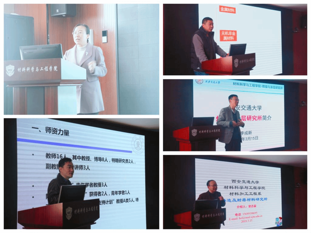 强度研究室孙巧艳教授,从强度研究室的研究方向、师资队伍、科研项目和计划招生人数等情况入手,介绍了金属材料是国家经济建设的支柱,在航空航天、能源化工等领域应用广泛,金属材料是结构安全的保证,也承担着国家重大科技研发项目。材料物理与化学系主任马伟教授介绍了师资队伍、主要研究方向等内容,尤其强调了高分子方向设立本科生奖学金,鼓励学生精勤求学,努力上进;新材料研究室主任史忠旗讲到,新材料主要研究方向是新型的陶瓷材料,包括高频绝缘陶瓷,铁电陶瓷,导体陶瓷,生物陶瓷等,其开设的主要专业课有《陶瓷材料学》、《无机非金属的合成与制备》、《功能陶瓷与器件》。焊接研究所主任李成新,焊接专业是交大历史久远的专业之一,早在1955年交大西迁之前于上海成立。现有教师13名,主要研究方向有材料先进连接与控制技术、保护涂层与功能涂层制备、先进连接过程与质量控制等。铸造研究所主任皇志富讲述了铸造专业发展历史、学科演变,主要研究方向有材料先进连接与控制技术、保护涂层与功能涂层制备、先进连接过程与质量控制等,铸造专业有着较大的应用前景和科学价值。