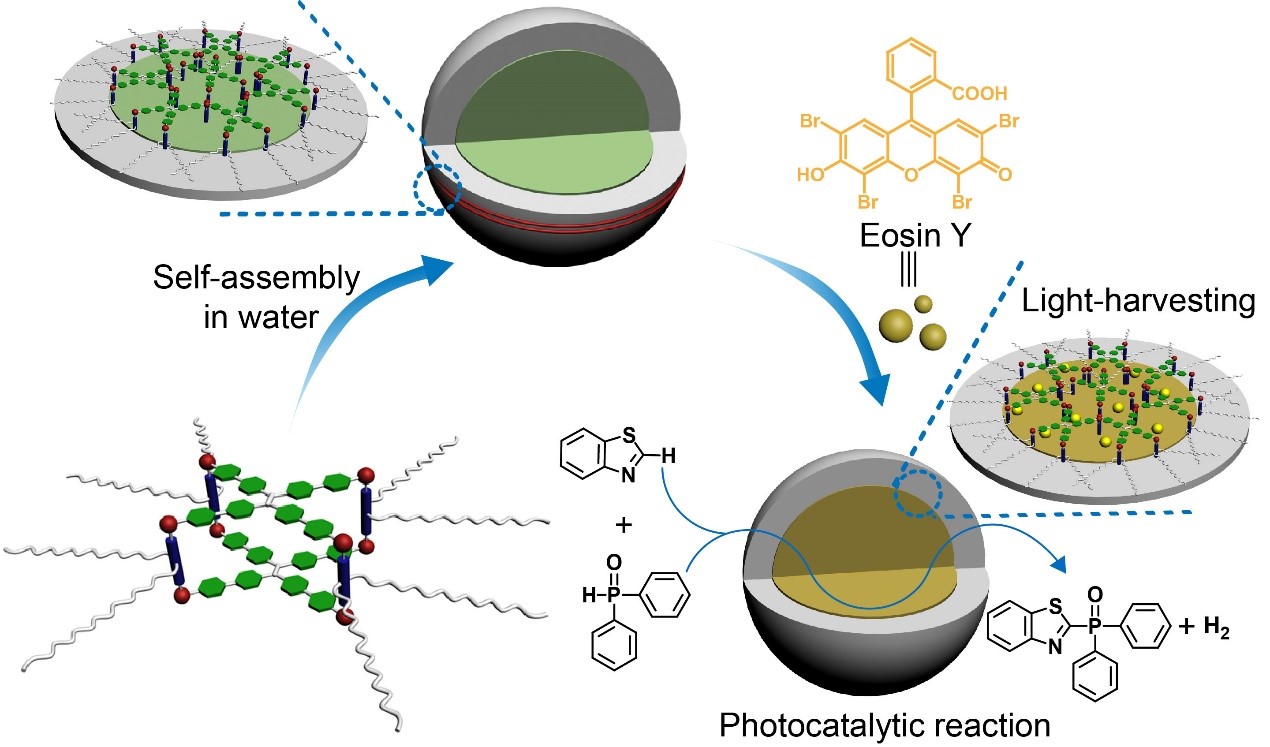 光合作用是地球上能量的主要来源。大部分植物和细菌通过这一过程完成对太阳能的吸收、捕获、转移和储存。在这个过程中,光能被密集的叶绿素分子阵列捕获并汇集到反应中心,然后转化为化学能。为了开发清洁和可持续的能源,目前越来越多的科研团队致力于模拟荧光共振能量转移(FRET)这一过程来构建人工光捕获体系,然而利用所捕获的光能进行光催化反应的研究鲜有报道。鉴于自然界中光合作用也是利用收集的光能进行化学反应,发...